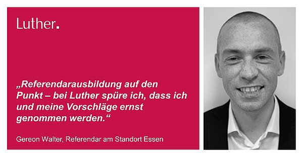 Gereon Walter ist Referendar am Standort Essen und arbeitet im Praxisbereich IP/IT. Im Interview berichtet er über seinen Weg zu Luther, die Vorbereitung auf die Examensprüfungen und seine Erfahrungen als frischer Vater während des Referendariats.