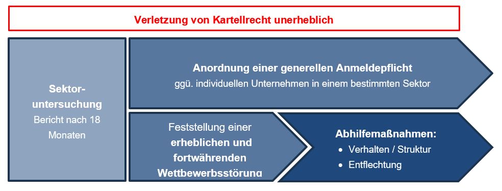 Bisher dienten Sektoruntersuchungen dazu, die Strukturen und Wettbewerbsbedingungen in bestimmten Wirtschaftszweigen zu untersuchen und zu analysieren. Im Vordergrund stand die Informationsgewinnung des Bundeskartellamts und die Schaffung einer Datengrundlage für die mögliche Einleitung weiterer Verfahren. Viele dieser Untersuchungen hatten bzw. haben eine lange Verfahrensdauer. Ihren Abschluss fanden sie bisher regelmäßig in einem Bericht des Bundeskartellamts, weitere unmittelbare Folgen waren nicht vorgesehen – insbesondere richteten sich die Marktstudien nicht gegen einzelne Unternehmen. Wenn das Bundeskartellamt ein wettbewerbswidriges Verhalten (vermutete), konnte es bislang zwar Einzelverfahren gegen die betroffenen Unternehmen einleiten, jedoch dies nur mit der vollen Beweislast und den "gewöhnlichen" Maßnahmen, um sie zu stoppen.
