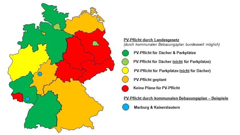 Gleichwohl haben zahlreiche Bundesländer (Baden-Württemberg, Berlin, Hamburg, Niedersachsen, Nordrhein-Westfalen, Rheinland-Pfalz, Schleswig-Holstein) – in unterschiedlichem Intensivierungsgrad – Pflichten für Bauherren bzw. Eigentümer von Grundstücken zur Installation (und zum Betrieb) von PV-Anlagen auf Gebäudedächern bzw. über offenen Parkplatzflächen normiert. Weitere Länder (Bayern, Bremen, Hessen, Mecklenburg-Vorpommern) befinden sich derzeit in entsprechenden (fortgeschrittenen) Gesetzgebungs- bzw. Planungsprozessen, sodass hier zeitnah mit vergleichbaren Pflichten zu rechnen ist. In anderen Ländern (Brandenburg, Saarland, Sachsen-Anhalt, Sachsen, Thüringen) liegen demgegenüber noch keine Pläne zur Einführung einer PV-Pflicht durch (einfaches) Landesgesetz vor.