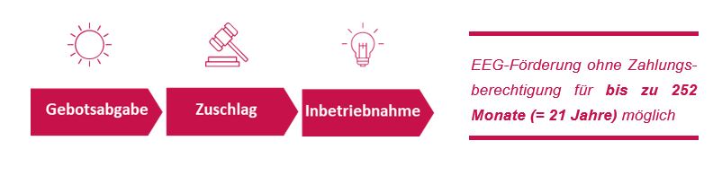 Ein erteilter Zuschlag berechtigt künftig unmittelbar zur Inanspruchnahme der Förderung nach dem EEG 2021, es bedarf keiner Beantragung einer Zahlungsberechtigung mehr bei der BNetzA. Zudem verfällt der Zuschlag nicht mehr bei Überschreitung bestimmter Realisierungsfristen, sondern gilt ab Veröffentlichung des Zuschlags 21 Jahre. Wird die Anlage unmittelbar nach veröffentlichtem Zuschlag in Betrieb genommen, ist daher eine Verlängerung der Gesamtförderdauer um bis zu ein Jahr möglich.