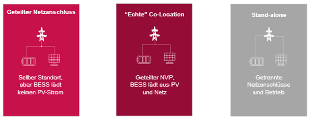 In der Praxis werden unter Co-Location-Projekten verschiedene Gestaltungen verstanden, die eine Kombination von Erneuerbare-Energien-Anlage (z.B. PV-Anlage) und Speicher beinhalten. Nutzen beide Anlagen einen gemeinsamen Netzverknüpfungspunkt und wird der Speicher sowohl mit Strom aus der PV-Anlage als auch aus dem Elektrizitätsversorgungsnetz geladen, ist häufig von „echter“ Co-Location die Rede (siehe Grafik, Kasten in der Mitte).