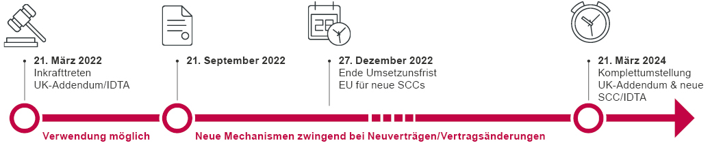 Seit dem 21. März 2022 können das UK Addendum oder das IDTA verwendet werden. Für einen Übergangszeitraum bis zum 21. März 2024 können die alten EU SCCs in UK weiter verwendet werden, soweit die zugrunde liegenden Verarbeitungsvorgänge sich nicht ändern. Ab dem 21. September 2022 müssen Unternehmen für neue Vereinbarungen sowie Vertragsänderungen das IDTA oder die neuen EU SCCs mit UK Addendum abschließen.