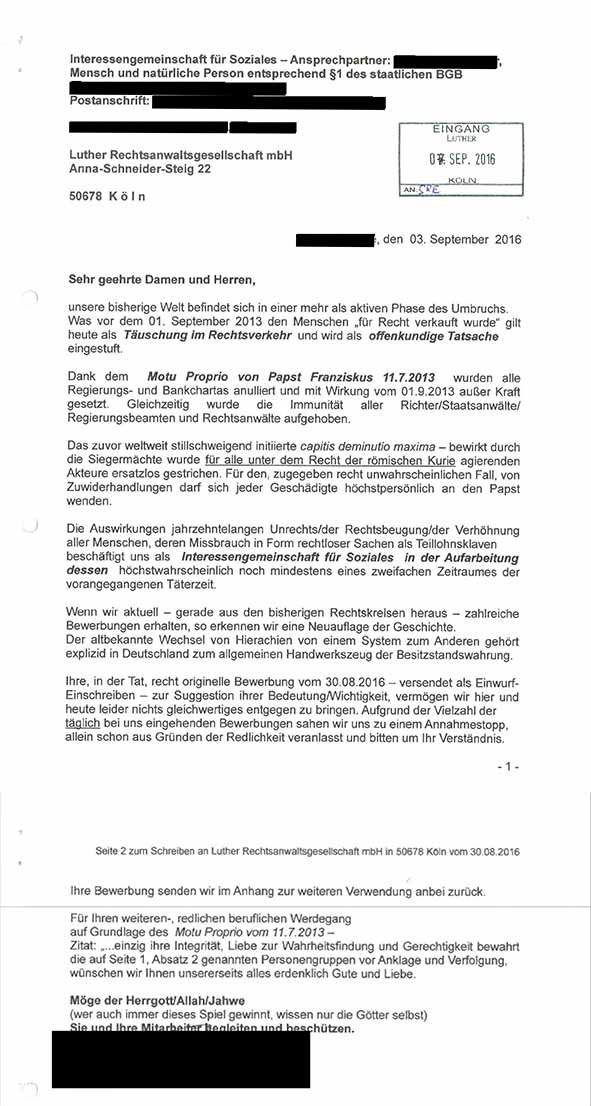 Auch Rechtsanwälte, die Abmahnschreiben an einen Reichsbürger richten, sind vor Überraschungen nicht sicher: Auf ein Abmahnschreiben an einen Reichsbürger erhielt ein Rechtsanwalt des Complex Disputes-Teams postwendend die Mitteilung, seine „in der Tat recht originelle Bewerbung“ könne nicht berücksichtigt werden – zurzeit herrsche ein Annahmestopp für Bewerbungen. Darüber hinaus sei die Immunität aller Richter, Staatsanwälte, Regierungsbeamten und Rechtsanwälten durch ein apostolisches Schreiben des Papstes aufgehoben worden. Einfach nur kurios.